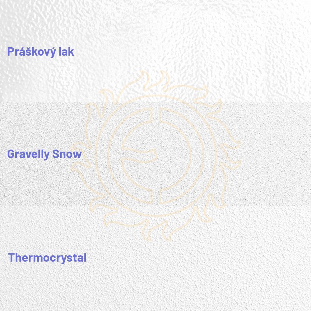 Sálavé topné panely ECOSUN K+ jsou opatřeny unikátní povrchovou úpravou se zrnitou strukturou, která výrazně zvětšuje sálavou plochu a vyznačuje se nejvyšší účinností při emisi tepelného záření. Panely v bílé barvě mají jemné pískování Gravelly Snow, panely v barvě hnědé mají pískování Thermocrystal s výraznější strukturou.